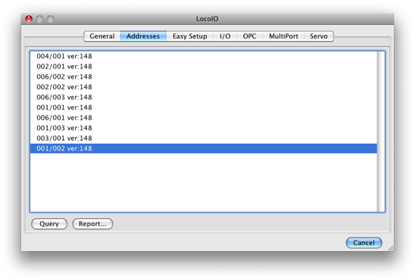 Le bouton Query(Requète) diffuse une obtention SV 0 à l'adresse 0/1 et tous les modules basés sur LocoIO connectés répondront et seront listés.