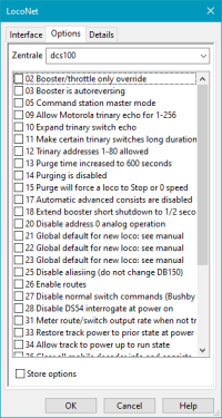 Der options-Eintrag wird automatisch von der loconet library hinzugefügt nachdem der "config slot" der Zentrale ausgelesen wurde. Der Binärwert im options--Abschnitt "opsw" wird im Loconet-Dialog "Options" in lesbarer Form dargestellt. Hier kann die Auswahl der Optionen geändert und zur Zentrale zurückgespeichert werden.