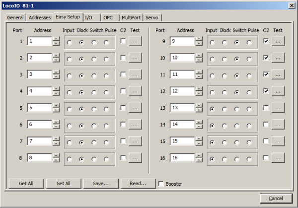 Diese Option stellt die Ports 14 - 16 auf vorgegebene Werte ein, wie sie vom internen LocoIO des GCA108 LocoNet-Booster benötigt werden.