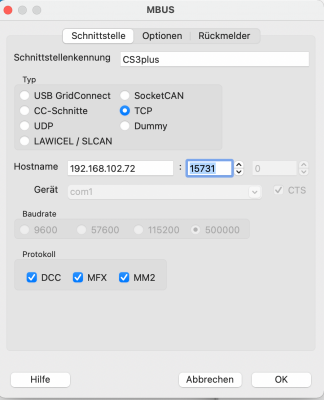 Das Ziel von MBUS ist es, das CAN-CS2-Protokoll für das Fahren von Zügen und die Steuerung von Ein-/Ausgängen zu verwenden.