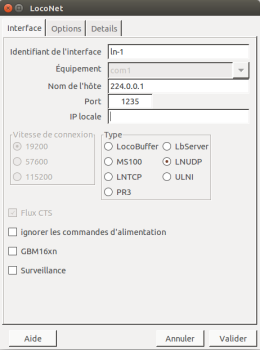 LA communication entre Rocrail et le GCA101 se fait par Protocole de Datagramme Utilisateur. Par conséquent seulement le type d'interface LocoNet LNUDP est supporté.