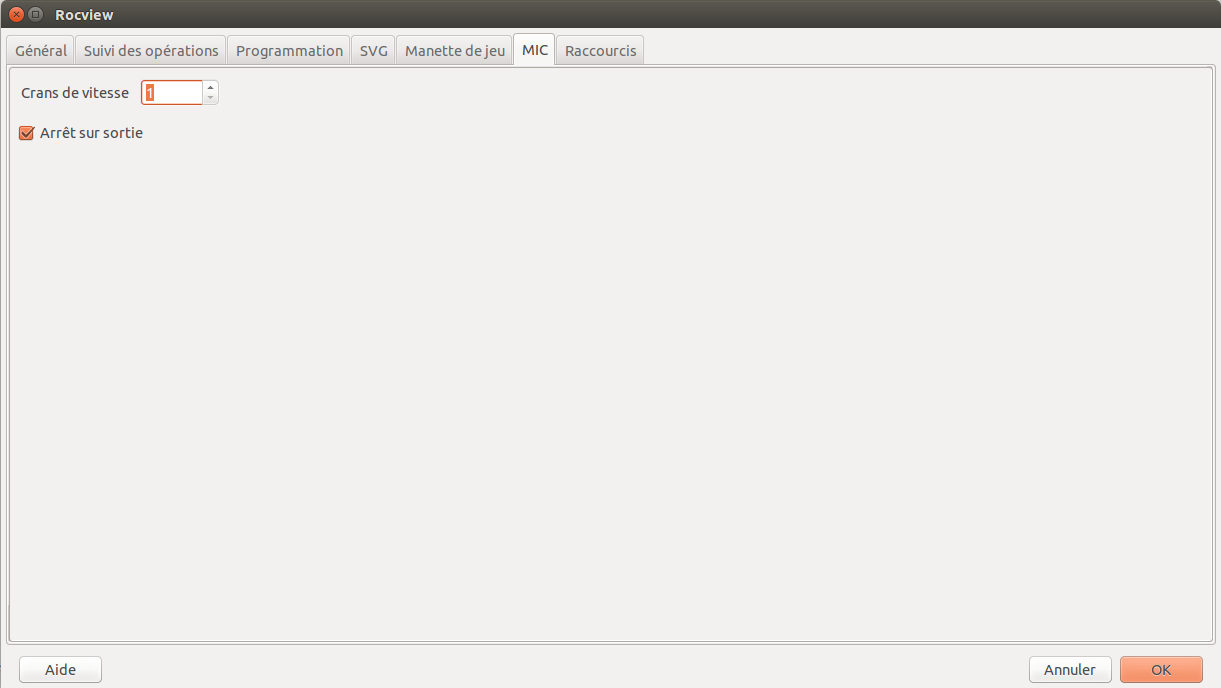 A la sortie, le mode MIC arrête la locomotive, ce qui est le comportement par défaut. Ceci peut être changé dans le fichier gui.ini: <mic step="1" exitstop="true"/> paramètre exitstop mis à false. (la loco continue de rouler à la dernière vitesse réglée!!!) L'attribut step détermine combien de cran de vitesse chaque mouvement de molette seront pris en compte pour l'accélération/décélération.