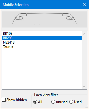 The filter can be used to either show all locomotives (all, default), or only those that are not assigned to a block (unused) or only those that are currently assigned to a block (used). The last selection made is retained when the dialogue is closed and reopened.