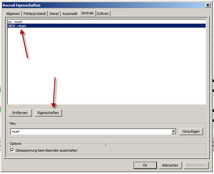 Wenn dort noch die virtuelle Zentrale vorhanden sein sollte, diese bitte löschen, indem die Zentrale markiert und anschließend der Button "Löschen" gedrückt wird. Danach aus dem Bereich NEU aus dem Drop-Down-Menü die Zeile mit dem Eintrag "muet" auswählen und den Button Hinzufügen drücken.