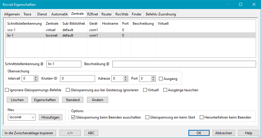 Über Datei → Rocrail Eigenschaften und Register Zentrale kann man weitere Zentralen definieren: