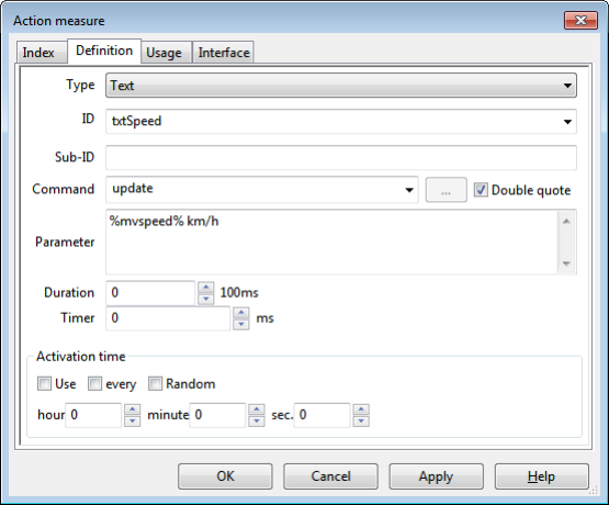 The measured values can be used with the rocrail variables %mvspeed% and %mvtrainlen% as Dynamic text in a Action of type "text".