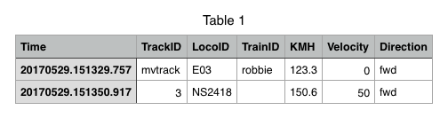 Time,TrackID,LocoID,TrainID,KMH,Velocity,Direction 20170529.151329.757,mvtrack,E03,robbie,123.3,0,fwd 20170529.151350.917,3,NS2418,,150.6,50,fwd