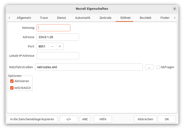 Die Rocrail.ini's müssen mit einem R2Rnet-Eintrag erweitert werden: