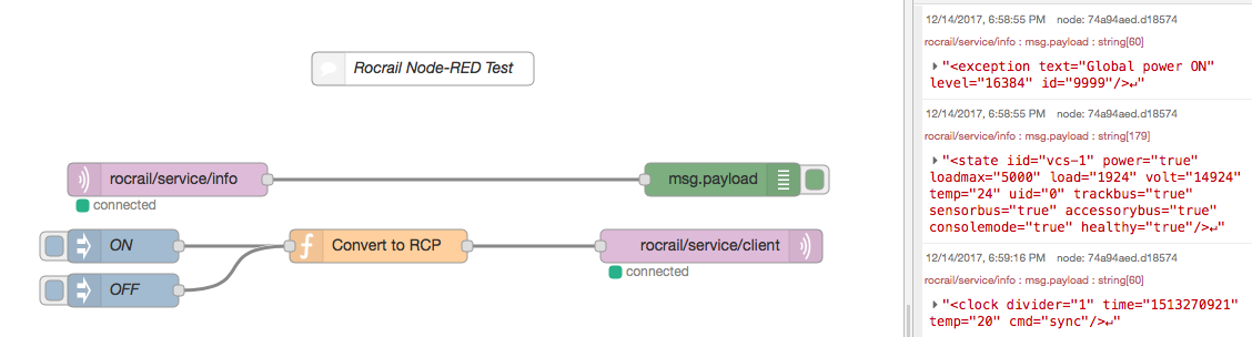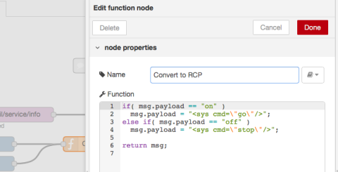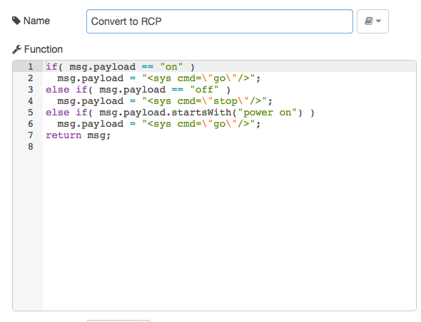 The two inject nodes on the left send at click a string to the function node in the middle. This function node tries to translate the string into a RCP XML message.