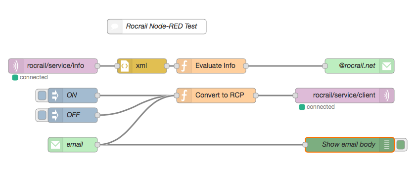 The MQTT node on the top left listens to Rocrail info messages, and shows them with help of a debug node on the right pane.