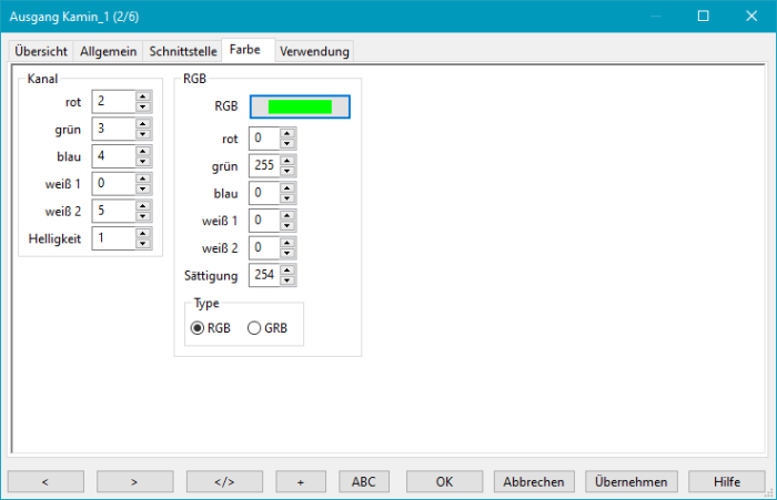 - DMX Art-Net; Die Kanalnummern sind relativ zur Schnittstellen-Adresse minus eins.