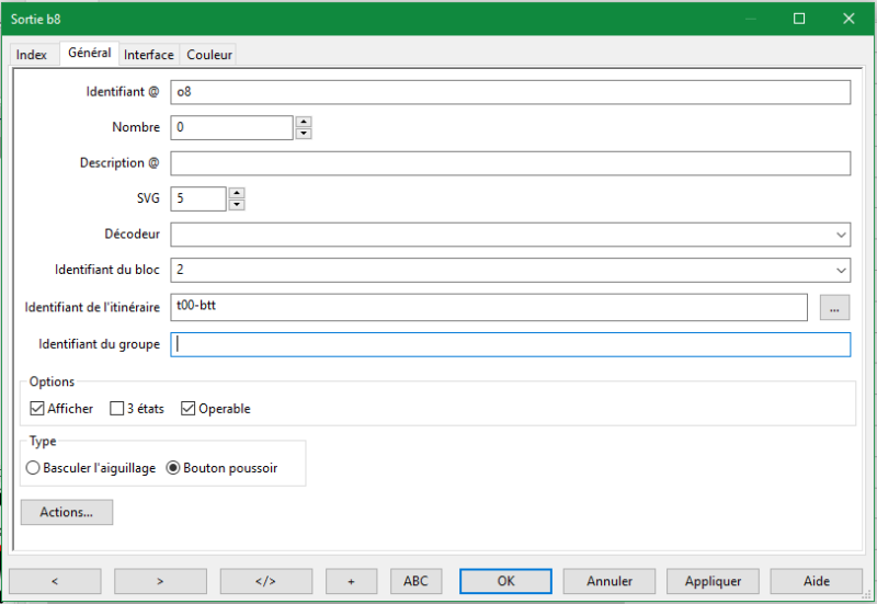 L'identification est utilisée par le programme comme clé d'identification unique pour référencer la sortie et est dès lors très importante. Si vous changez l'ID d'une sortie, vous devrez changer toutes les autres fonctions qui y font référence dans le programme, comme par exemple les actions dans l'onglet routes.