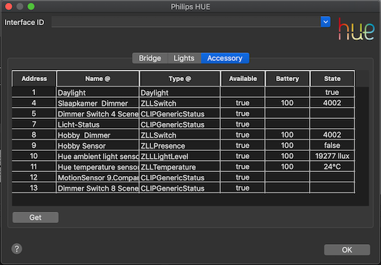 This list can be helpful for checking which lights are known, and under which address, by the connected bridge.