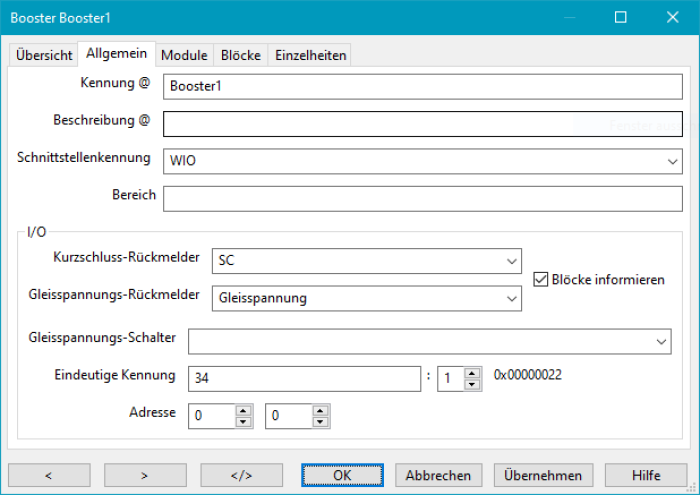 Die Felder Kurzschluss-/Gleisspannungs-Rückmelder und Gleisspannungs-Schalter werden nicht verwendet und können leer bleiben.