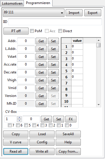 Mit Hilfe der Schaltflächen Read all, Write all und Copy from kann ein neuer Dekoder mit bereits abgespeicherten Werten versehen werden, oder ein Backup aller CVs eines Dekoders erstellt werden.