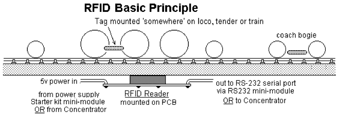 The basic principles of RFID are very simple. A small glass tag encapsulating a unique identification code is affixed to the underside of the model and a trackside/roadside reader charges it up as the model passes by to enable it to transmit its code to the reader. Standard serial data is then available to be passed to a computer.