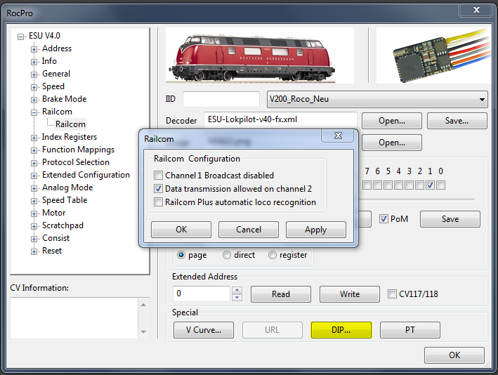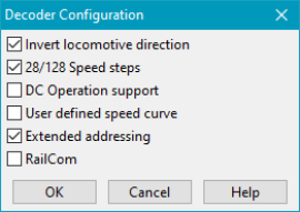 ![]() | Lok-Fahrrichtung umkehren 28/128 Fahrstufen Gleichstrombetrieb unterstützen Benutzerdefinierte Geschwindigkeitskurve Erweiterte Adressierung = lange Adresse RailCom aktivieren |