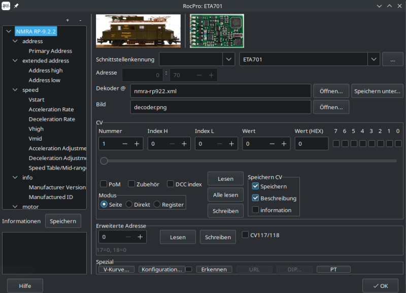 Die entpackten Dateien können an Stelle der voreingestellten Datei nmra-rp922.xml geladen werden und enthalten dekoderspezifische CVs und ggf. deren Beschreibungen.