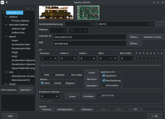 Die entpackten Dateien können an Stelle der voreingestellten Datei nmra-rp922.xml geladen werden und enthalten dekoderspezifische CVs und ggf. deren Beschreibungen.