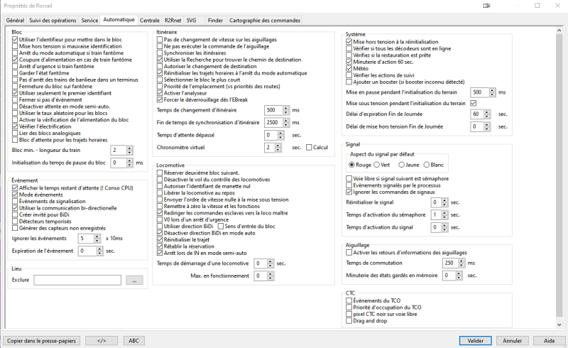 | Cette option sera réinitialisée après que le mode automatique ai été mise en marche jusqu'au prochain démarrage de Rocrail. |