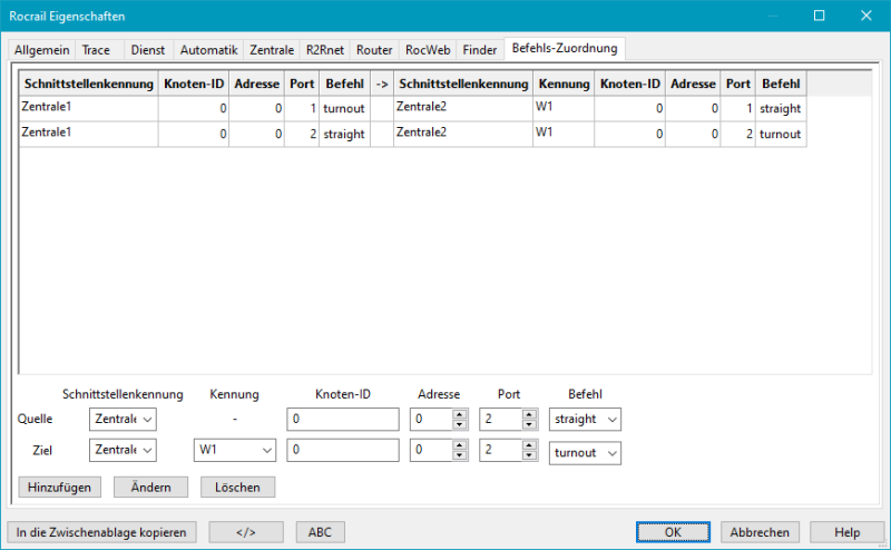 Rocrail-Eigenschaften Registerkarte 'Befehls-Zuordnung'