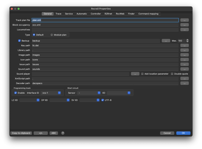 If a file name is entered, Rocrail has to be restarted. After that with "File / Save" the plan file is saved and the locomotive definitions are moved to the newly defined locomotive file.