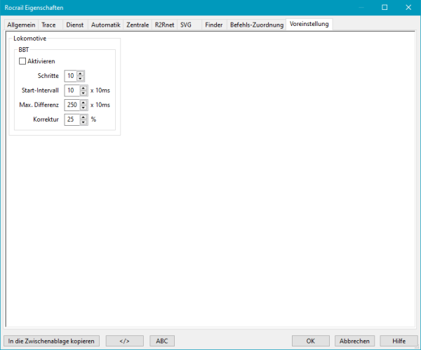 - Allgemein | Trace | Dienste | Automatik | Zentrale | R2Rnet | SVG | Finder | Befehls-Zuordnung | Voreinstellung