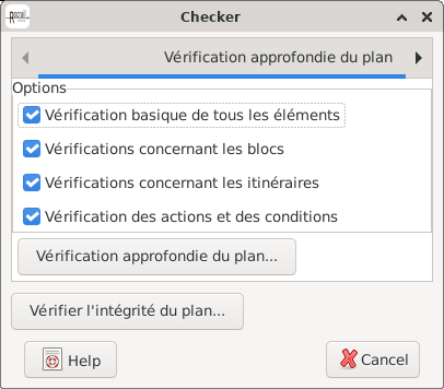 Rocrail vérifie automatiquement l'état du plan de voie à chaque démarrage. Il n'y a pas d'options pour cette vérification automatique.