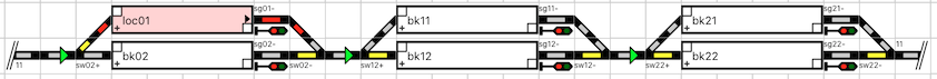 Dieser komplexerer Plan enthält einen virtuellen Block und Kehrschleifen. Hinweis: Für einen Block-Trip immer die Ausgangs-Signale anklicken.