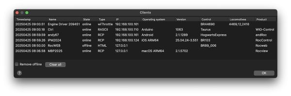 The Client log listed up all client connections and shows which locomotive is currently controlled.