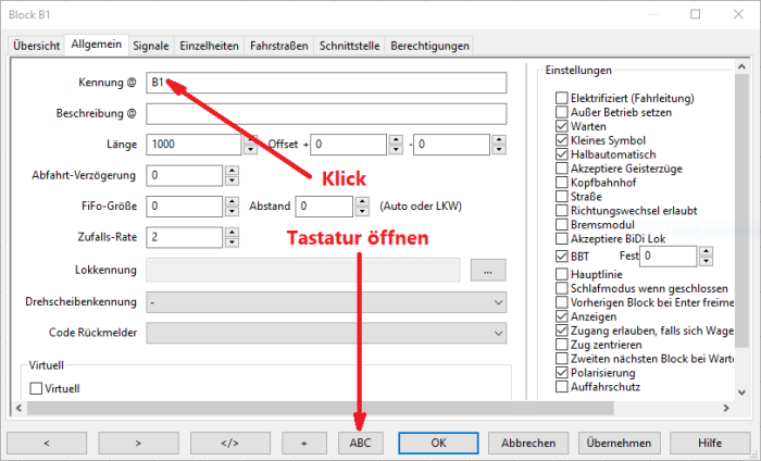 In Dialogen, die eine [ABC]-Schaltfläche anbieten, können einige Textfelder durch die virtuelle Tastatur editiert werden.