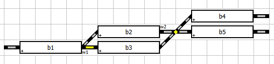 Turnout w1 is a normal switch, the crossing w2 is not adjustable (no slip switch). Consequently, a drive b3 to b5 or b2 to b4 is not possible. Let us imagine that in blocks b2 and b3 a train leaves, then there is a risk that at the intersection by w2 the trains could crash at the junction. Therefore, it is important to include passive crossings and switches that can be "cut" in the driveway, so they can be blocked for other trains, as long as a train passes through this route.