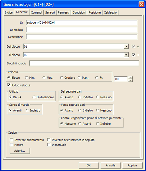 - Controlli From To e Entrambe le direzioni se una loco può spostarsi solo in un senso lungo l'itinerario, senza tener conto del verso. Per esempio, se l'itinerario 1-2 è From To, una loco si può muovere solo da 1 a 2.