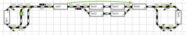 The locomotive runs from right to left - from block bk04 (plus side) to block bk01 (minus side) with the via blocks bk03 and bk02.