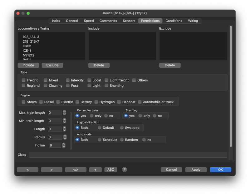 - The list "Include" is evaluated with priority. If locomotives or trains are entered here, the route can only be used by these locomotives or trains.