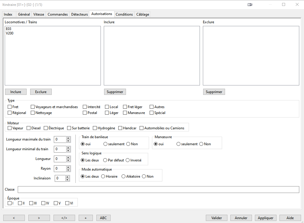 Pour prévenir que certaines Locomotives et ou certaines Unités Multiples n'utilisent un itinéraire cet onglet permet de définir qui est autorisé à faire quoi.