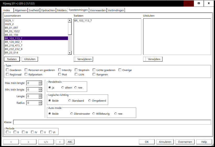 Het voorbeeld laat zien dat de BR_103_113_7 in deze rijweg is toegestaan. Voor deze rijweg is alleen de BR_103_113_7 toegestaan, alle andere locomotieven zijn uitgesloten.