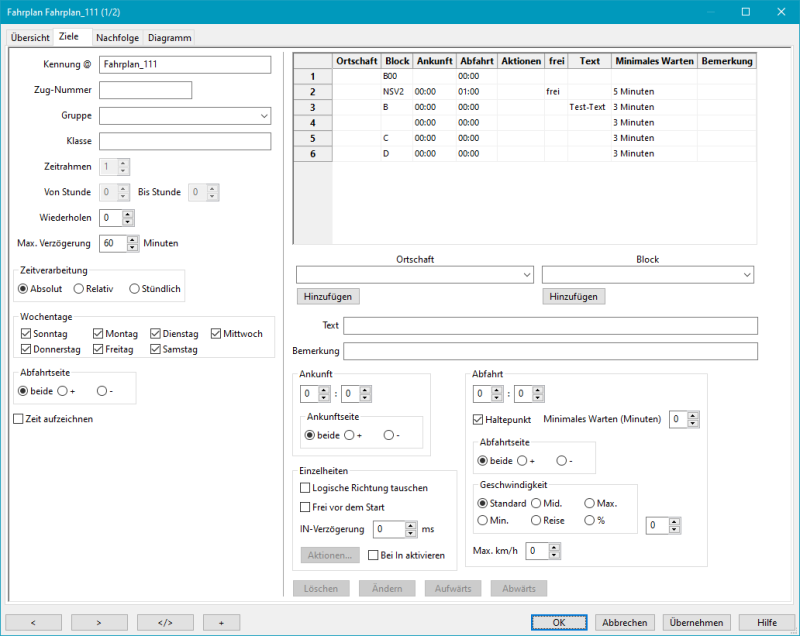 Hinweis: Angegebene Zeiten sind Abfahrtzeiten, keine Wartezeiten. Die effektive Aufenthaltsdauer ergibt sich aus der Zeit vom Eintreffen des Zuges bis zum Erreichen der Abfahrtzeit. Ist die Wartezeit (in den Lok- bzw. Blockeigenschaften) länger eingestellt, als die sich durch den Fahrplan ergebende Aufenthaltsdauer, so fährt der Zug möglicherweise verspätet ab.