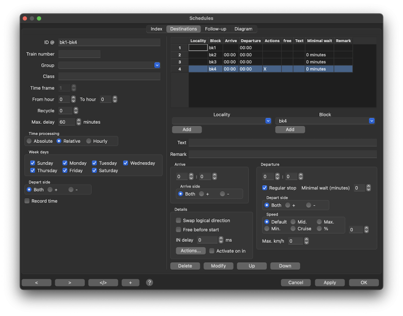 - Disabled: The selected destination is not a regular stop. The train will pass through, if possible and the departure time will be ignored, therefore noted in brackets ().