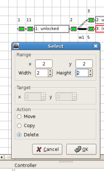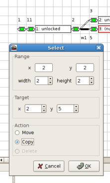 La boite de dialogue initialise la Plage X et Y avec la position du menu contextuel et est le coin supérieur gauche de la sélection. Avec les deux boutons “flèche” vous pouvez ajuster la taille du bloc à copier: Largeur et Hauteur. La Cible X et Y sera la position de la sélection copiée.