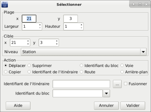 La boite de dialogue initialise la Plage X et Y avec la position du menu contextuel et est le coin supérieur gauche de la sélection. Avec les deux boutons "flèche" vous pouvez ajuster la taille du bloc à déplacer: Largeur et Hauteur. La Cible X et Y sera la nouvelle position de la sélection après le déplacement.