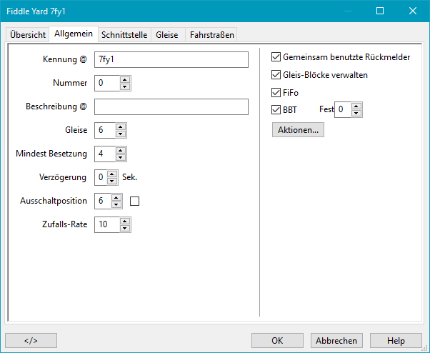 Fiddle-Yard-Dialog Karteireiter 'Allgemein'