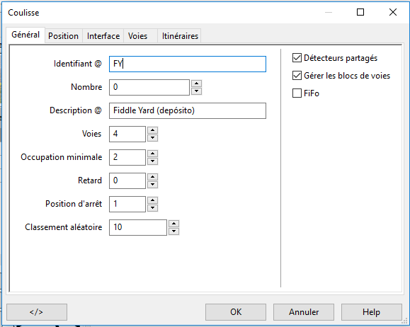 Plateau-Coulisse ("Fiddle Yard") boite de dialogue "Générale".