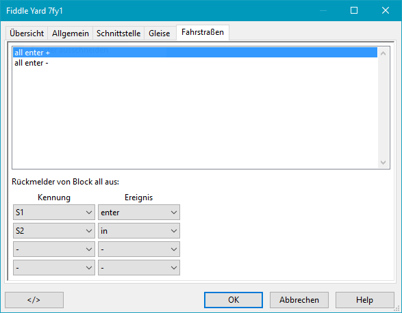 Die Einstellungen für die Fiddle Yard Fahrstraßen ist mit der Einstellung von Block-Fahrstraßen vergleichbar.