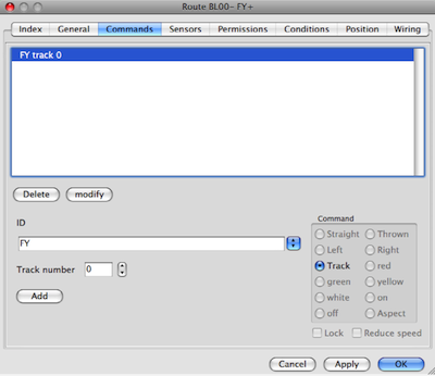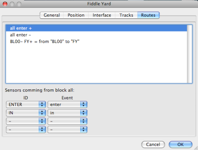 Don't forget to add a command in each route involving the fiddle yard as a non-locked number 0 track (see the picture). Otherwise trains will not stop until sensor FYPOS indicates the selection table is ready to admit or to liberate a loco.