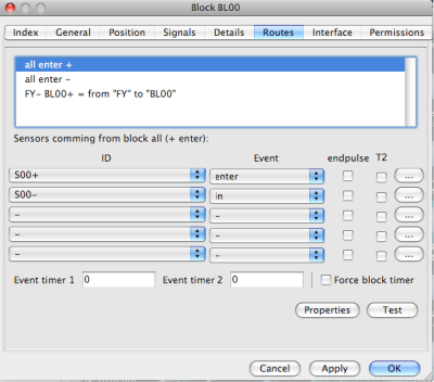 - Place a third loco (LOCO 3) in BL00 block. Check that its 'enter side matches the sense of the allowed movement (clockwise in this example), or 'Swap block enter side' if necessary.