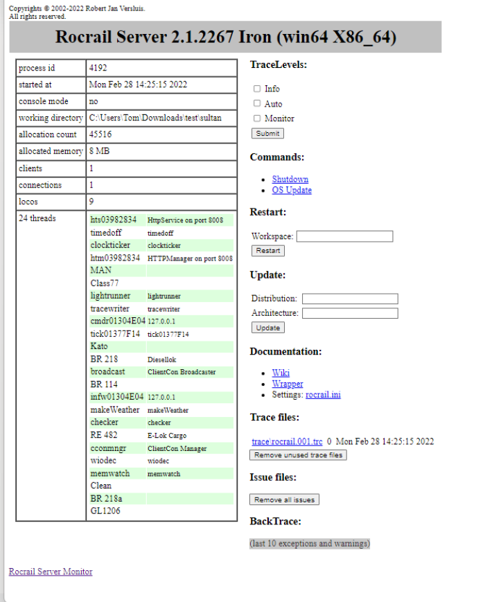 De Rocrail Server Monitor biedt basisinformatie en controle over de Server met een WEB Browser. Het draait op een lichtgewicht HTTP-server die in Rocrail is ingebouwd en die u kunt doorbladeren vanaf elke computer die de server kan bereiken via TCP/IP.