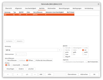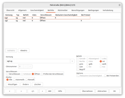 - Das Signal wird nicht automatisch auf "Rot" zurück gestellt, hierfür muss ein zusätzlicher Eintrag, mit rot "Bei Freiwerden" in der Fahrstraße erfolgen.