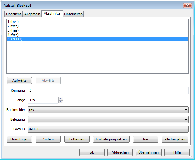 - Einstellen der Abschnitts-Eigenschaften, wie individuelle Länge und Rückmelder-Kennungen.