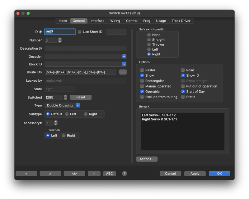 The block ID, sensor ID or output ID is used to set the representation of this track type to occupied. The sensor must be set Visible to be able to set the track occupied.